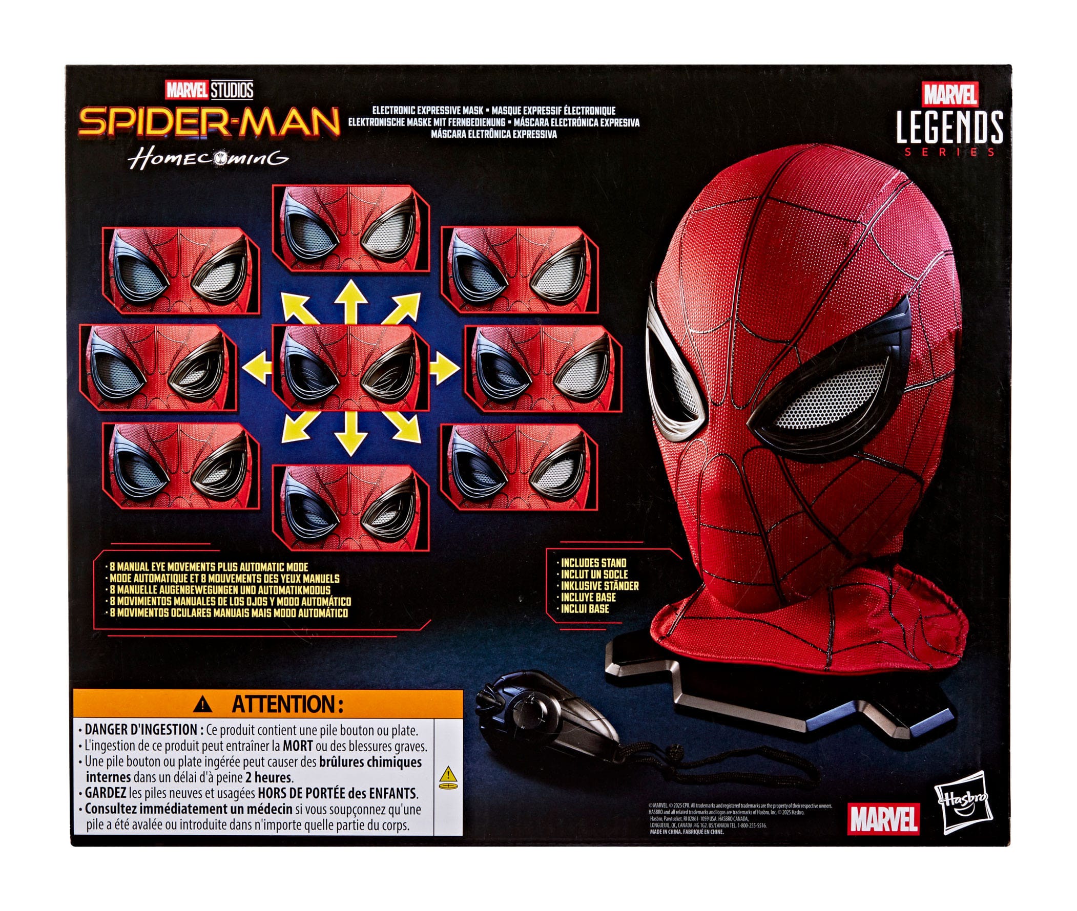 Hasbro Marvel Legends ist stolz auf die Präsentation dieser Nachbildung im Maßstab 1:1 von Spider-Mans Maske aus dem Film Spider-Man: Homecoming! Der Rollenspielhelm mit Premium Design und Deko besticht durch eine weiche Silikontextur und elektronische Augenbewegungen. Mit der enthaltenen Fernbedienung können Fans im manuellen Modus aus 8 verschiedenen Augenbewegungen wählen oder im Automatikmodus eine von 5 vorprogrammierten Sequenzen bestimmen. Die Sequenzen wurden entwickelt, damit sich realistische, von der Figur inspirierte Mimik und Reaktionen darstellen lassen! Die ausdrucksstarken Augenbewegungen können aktiviert werden, wenn die Maske getragen oder auf dem enthaltenen Ständer ausgestellt wird. Sie eignet sich zum Display in Fan-Kollektionen und ist prima als Ergänzung zu einem Spider-Man Halloween-Kostüm oder für ein Marvel Cosplay. Die Marvel Legends Action-Figuren, Rollenspielartikel und Sammlerobjekte laden die Fans dazu ein, Filmszenen nachzuerleben. (Jeweils separat erhältlich. Je nach Verfügbarkeit.)